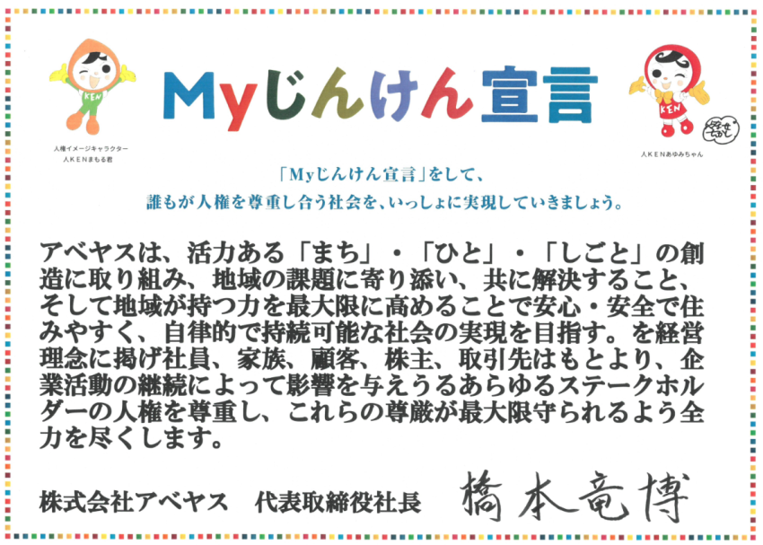 株式会社アベヤスでは、宣言を通じて人権尊重の姿勢を明確にし、ESG経営の深化を図っております。